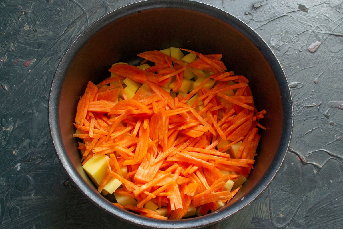 Шинкуем морковь тонкой соломкой. Кладём нарезанную морковку в кастрюлю следом за картофелем.
