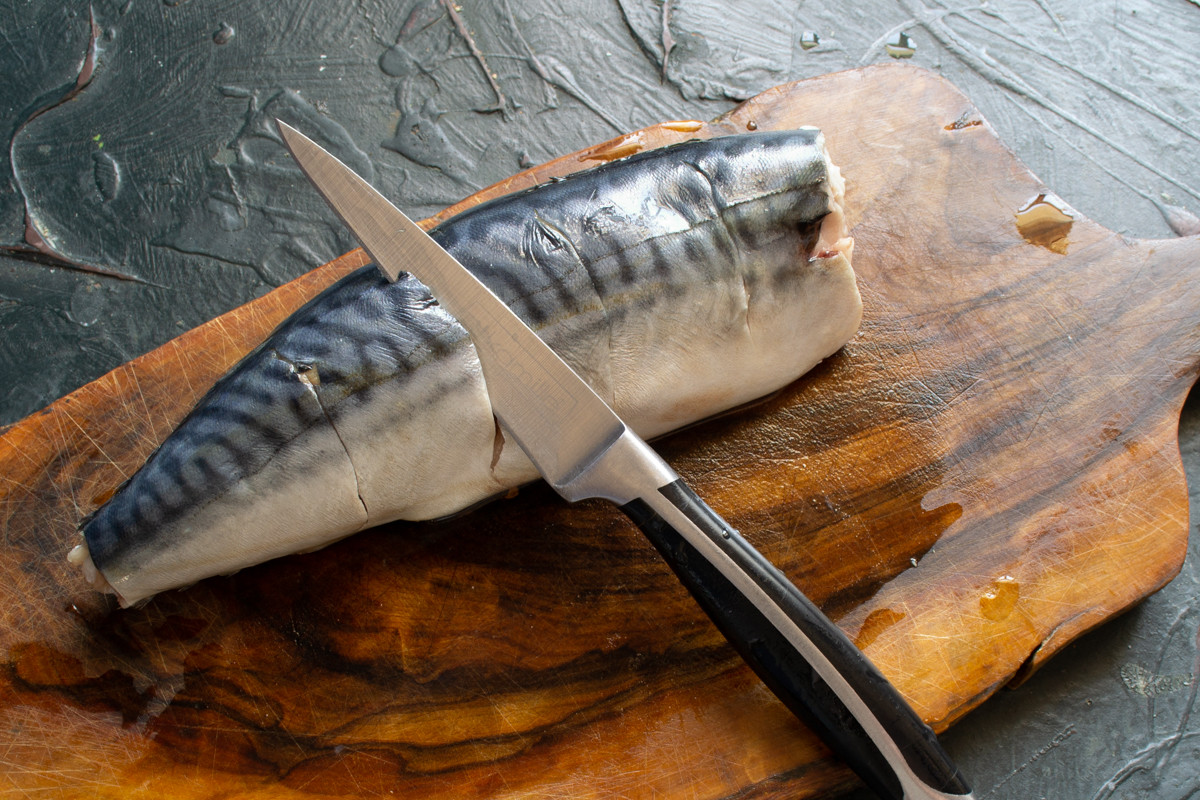 Хорошо промываем очищенную рыбью тушку холодной водой. Обсушиваем скумбрию бумажным полотенцем. Острым ножом делаем косые надрезы с двух сторон тушки, чтобы маринад хорошо пропитал рыбу.