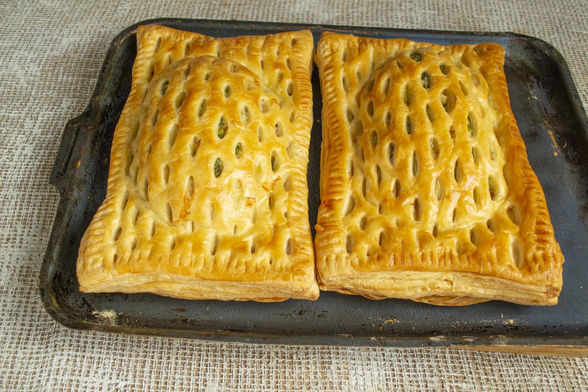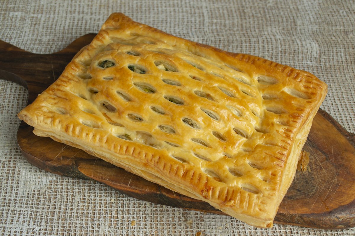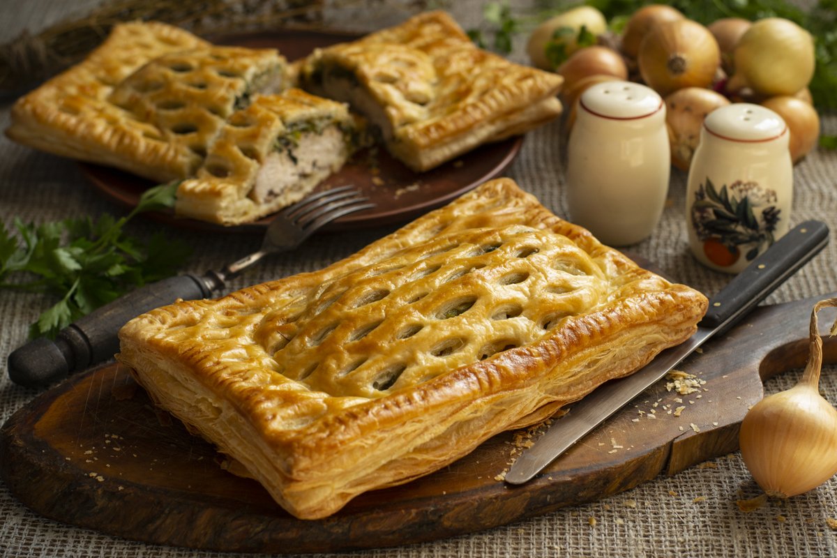 Подаём слоёный пирог с курицей на стол тёплым. Приятного аппетита.