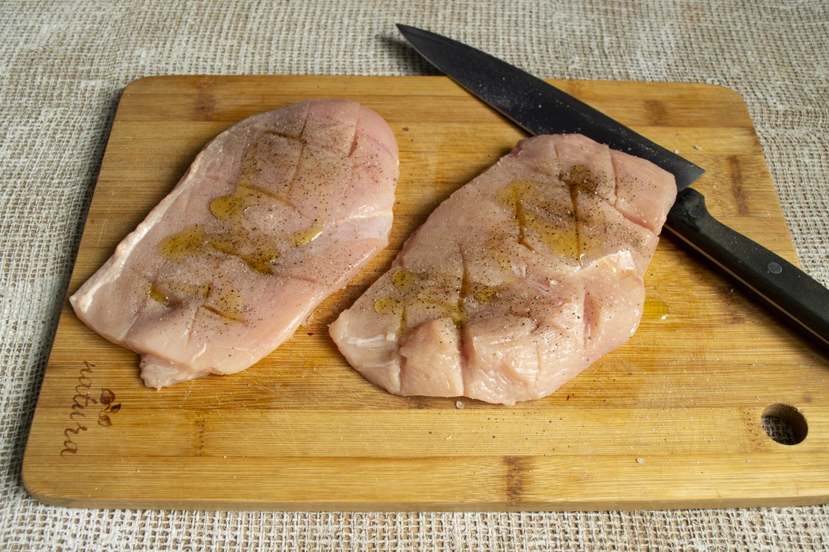 На куриной грудке делаем надрез вдоль килевой кости, снимаем кожу, срезаем филе сначала с одной, затем, с другой стороны. Острым ножом делаем косые надрезы на филе с двух сторон.