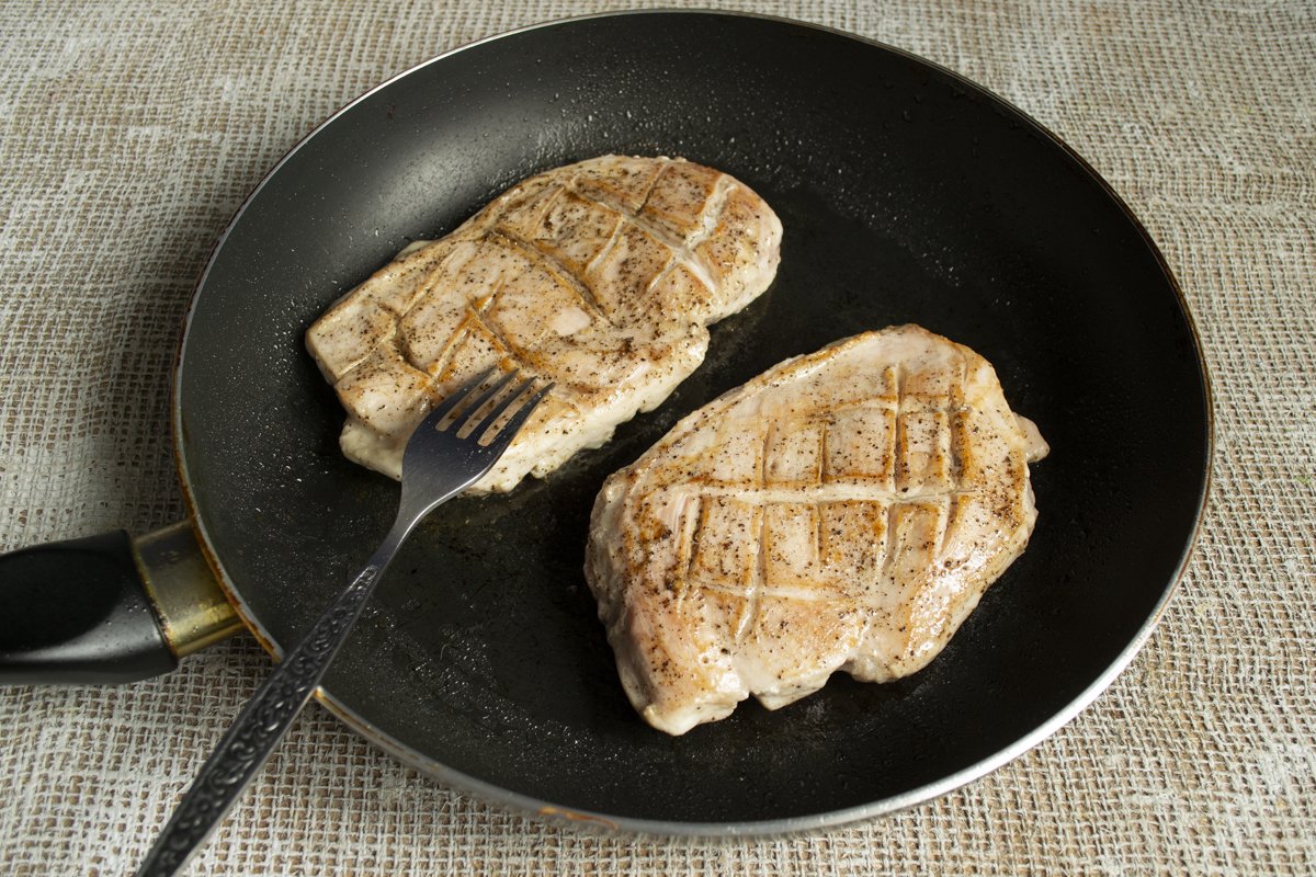 Хорошо нагреваем сковороду, быстро обжариваем филе с двух сторон примерно по 3 минуты с каждой. Выкладываем мясо на тарелку, остужаем.