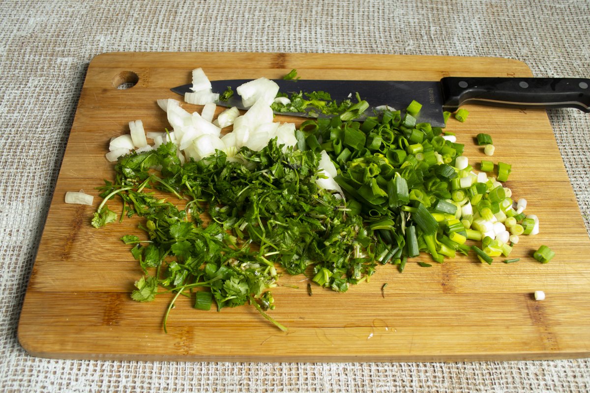 Мелко рубим головку репчатого лука, небольшой пучок лука и кинзу. Кстати, кинзу лучше резать вместе со стебельками и корешками, эти части растения добавят насыщенный вкус слоёному пирогу с курицей. В сковороде нагреваем растительное и сливочное масло, кладём зелень и лук в разогретое масло, солим, томим на умеренном огне 5-7 минут.