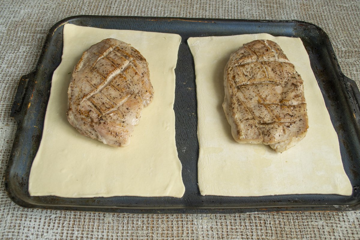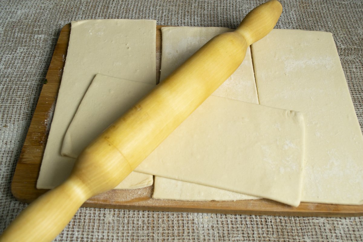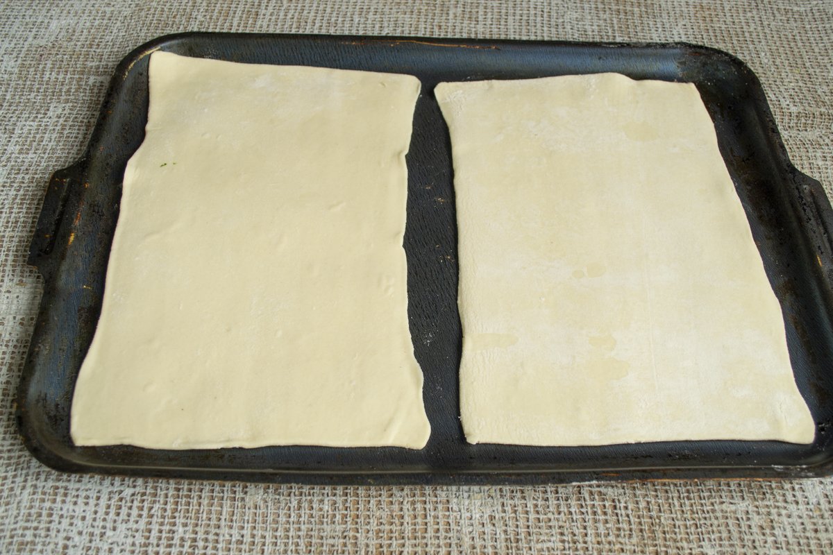 Готовое замороженное слоёное тесто за 30 минут до приготовления пирога с курицей достаём из морозильной камеры, размораживаем. Затем выкладываем пласты на присыпанную мукой доску, слегка раскатываем.