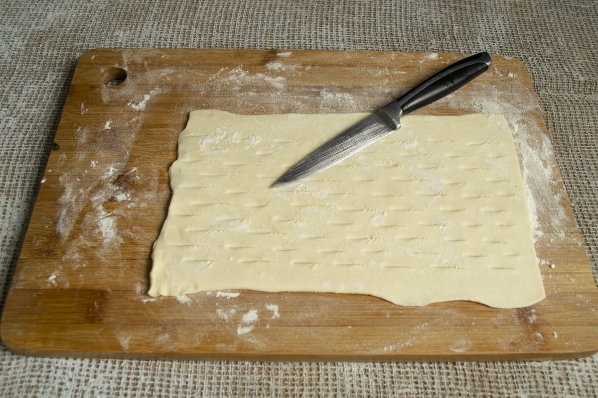 Два пласта теста оставляем как есть, а два нужно надрезать. Есть специальный валик с насечками, с его помощью получается симпатичный узор. Если валика нет, то делаем надрезы острым ножом в шахматном порядке, так как показано на фото.
