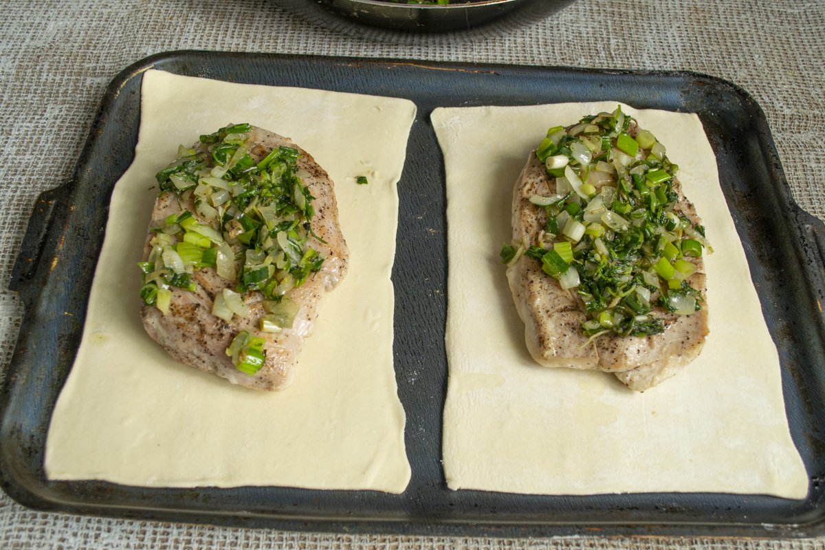 На филе кладём 2-3 столовые ложки пассерованной овощной смеси, распределяем смесь ровным слоем по мясу.