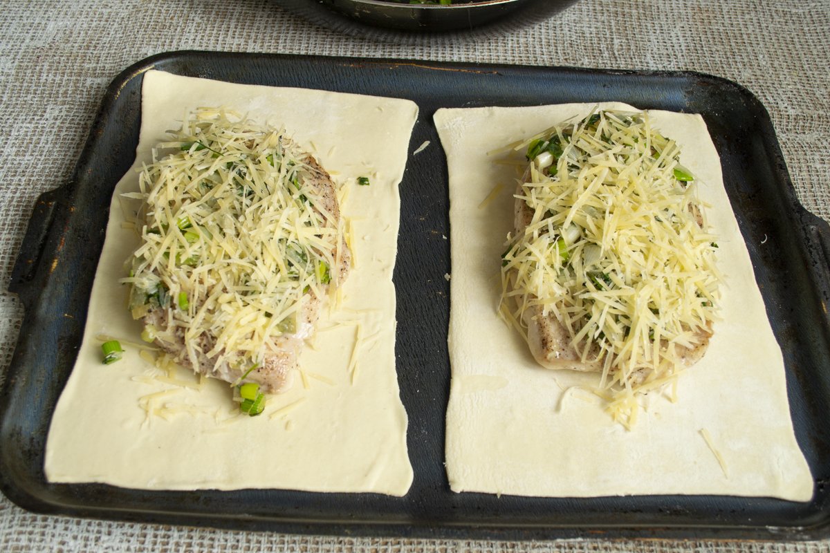 Слоёный пирог с курицей, пармезаном и зелёным луком из готового слоёного теста легко приготовить за полчаса. Размер пирога — на ваше усмотрение, но, из собственного опыта, лучше делать средние пироги размером с мужскую ладонь из половинки куриной грудки, как раз получается добротная порция. Мужчинам то, что надо, а дамы и малышня свои пирожки могут делить на несколько частей. Тесто в рецепте слоёное бездрожжевое, не нужно ждать пока поднимется, а на вкус не хуже того, что с дрожжами.