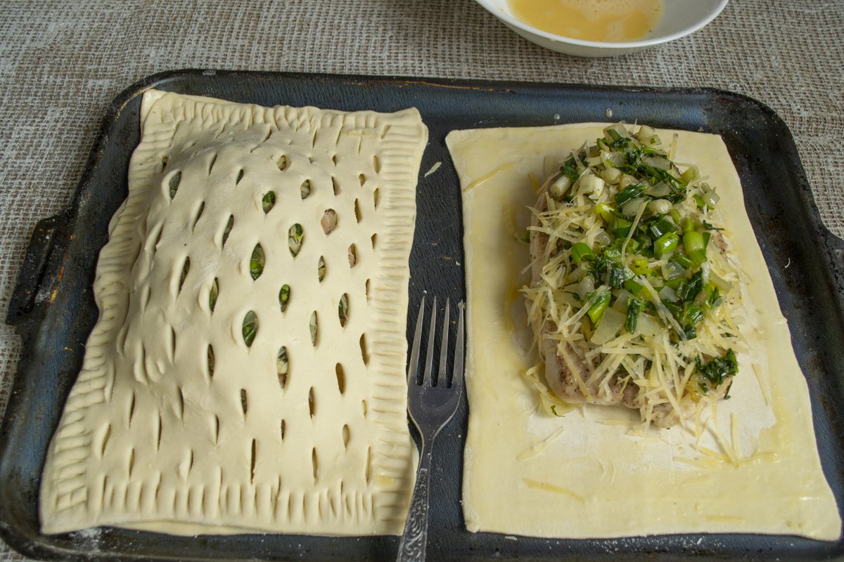 Разбиваем свежее куриное яйцо в мисочку, взбалтываем вилкой. Смазываем тесто вокруг начинки яйцом, кладём надрезанный пласт на начинку, прижимаем края вилкой.
