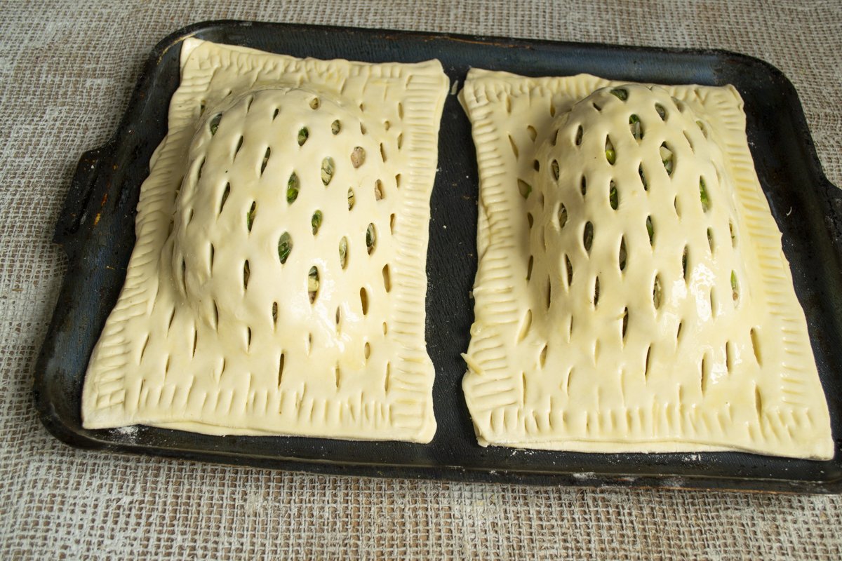 Также формируем второй пирог, смазываем тесто взбитым яйцом. Нагреваем духовой шкаф до 200-230 градусов по Цельсию.