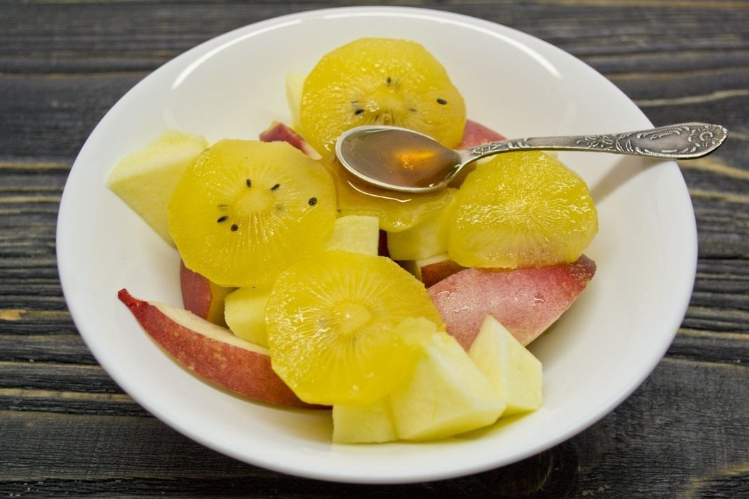 К фруктам добавляем мёд — ценный природный подсластитель, который в разумных пределах нужно включать в рацион здорового питания.