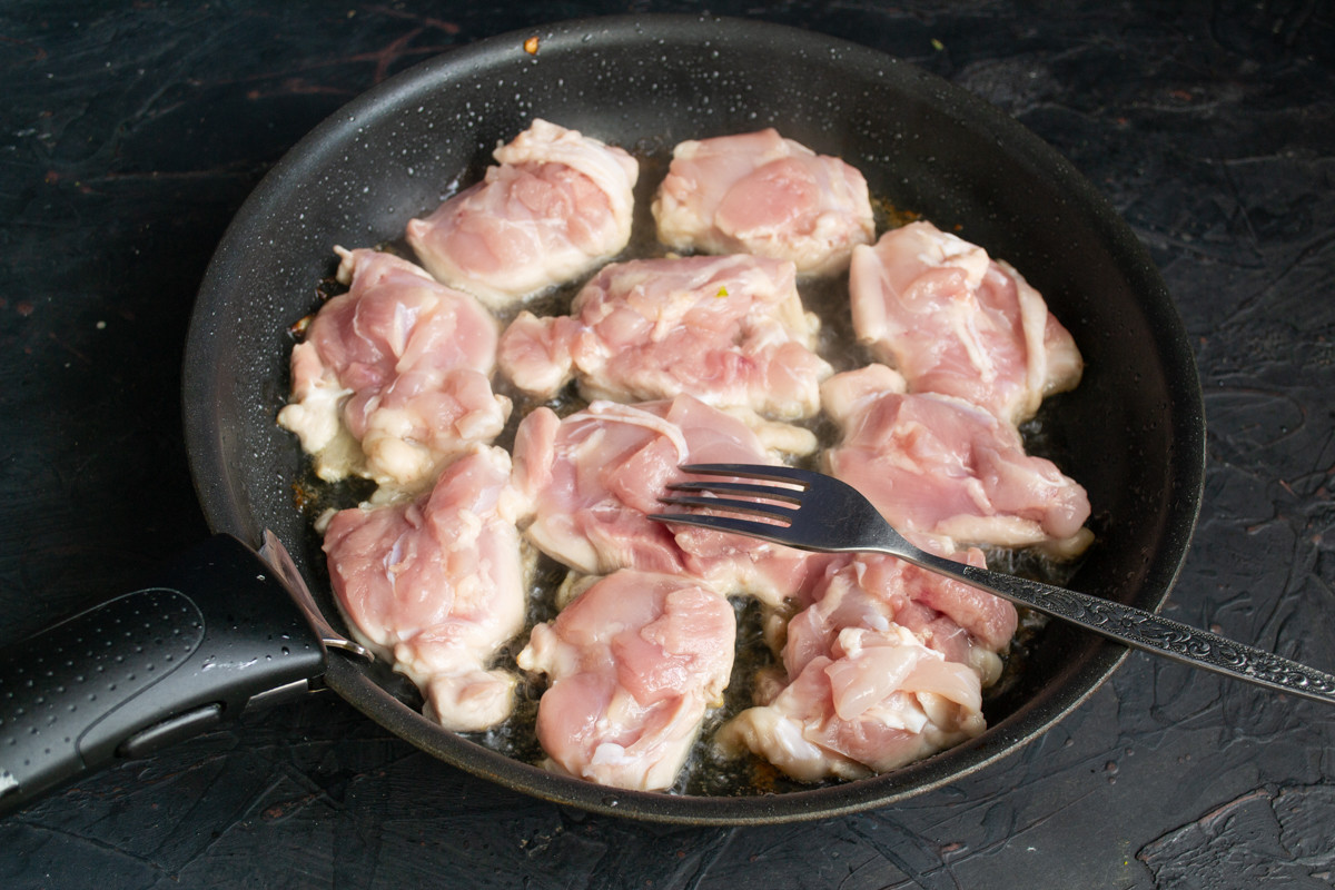 Наливаем в сковороду половину оливкового масла, нагреваем. В разогретое масло кладём кусочки курицы кожей вниз. Жарим на сильном огне до золотистого цвета, переворачиваем.