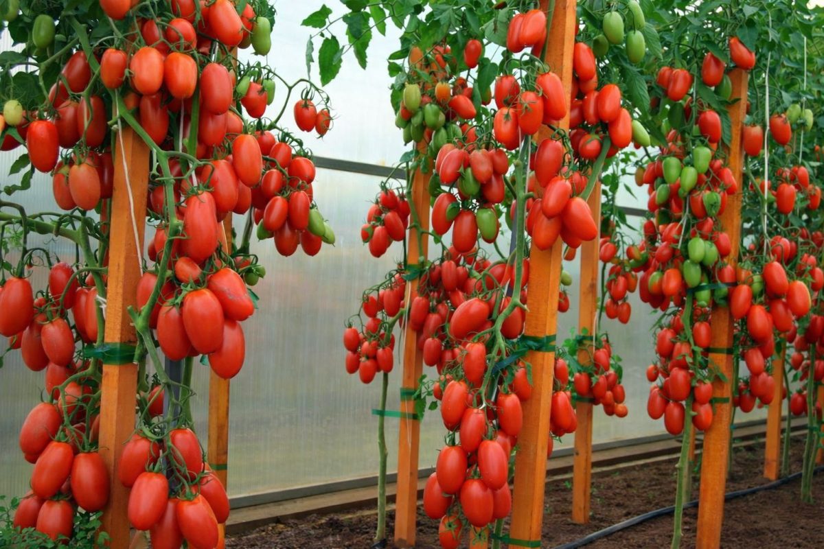 Куст штамбовый, крепкий, высотой 60–70 см. Штамбовость означает, что стебель толстый, жёсткий, не разваливается в стороны. Подвязать всё равно стоит, потому что при хорошем урожае кисти тяжёлые, но даже без подвязки куст не ляжет на землю, как некоторые другие сорта. Пасынковать почти не нужно — только для порядка убрать нижние, если они лезут в землю. Плоды завязываются дружно и созревают почти синхронно, что удобно для консервации.