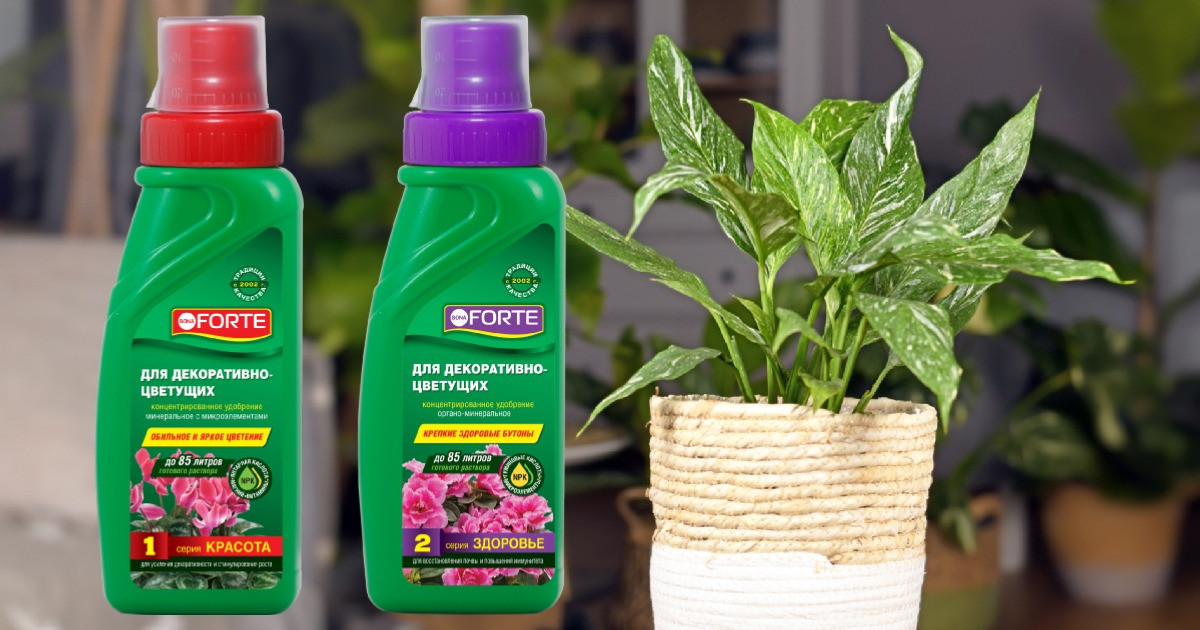 Ещё одно важное условие для поддержания красивой пёстрой окраски листьев – это подкормки. Составляя грунтовую смесь, мы, всё-таки, основной упор делаем на её физические свойства. А питательных компонентов в ней относительно мало, которые быстро заканчиваются. Сохранить вариегатность и поддержать здоровье спатифиллуму помогут жидкие концентрированные удобрения Для декоративно-цветущих Bona Forte серий Красота и Здоровье. Они дадут растениям всё необходимое и летом, и зимой.