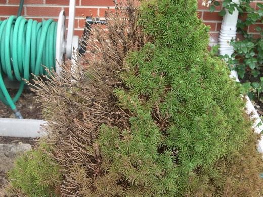 У меня эта тварь — ложный паутинный клещ живет именно на конике. И если 2 года назад я сумела уничтожить очаг, который уже выглядел именно вот так — пока я разбиралась, что же происходит, и не разглядела клещей под лупой. Никакой паутины, постепенное побурение хвои. Все же умные, опытные, блин, садоводы — солнечный ожог-солнечный ожог. А в этом году заболели соседние елочки. Прыскаю фитовермом. Но то ли график нарушила, то ли эти твари привыкли. Третья вспышка за лето.