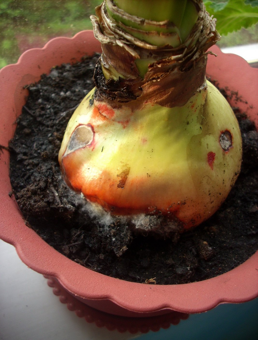 Нужно ли срочно вынимать луковицу или ждать – решать только вам, ориентируясь прежде всего на цветение. Если у вас сильно страдает цветение, то лучше не оттягивать пересадку и проводить эту процедуру экстренно. Если же растение цветет без особого ущерба, то для него резко сокращают поливы, чтобы быстрее перевести в фазу покоя, видимые повреждения обрабатывают медьсодержащими препаратами и проводят профилактическое опрыскивание фунгицидами. А полную обработку проводят позже, во время выкопки.