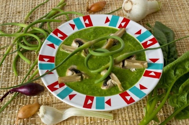 Счастливые обладатели собственного огорода могут приготовить суп-пюре со шпинатом и стрелками чеснока и насладиться его вкусом уже через полчаса после сбора урожая. Зелень с рынка также можно неплохо сохранить для этих целей: поместите шпинат с корнями в большую кастрюлю или миску с холодной водой, поставьте на нижнюю полку холодильного отделения. В течение недели меняйте воду ежедневно, и свежая зелень всегда будет у вас под рукой. Рецепт этого густого крем-образного супа-пюре со шпинатом, стрелками чеснока и грибами подойдёт для вегетарианского стола и диетического питания.