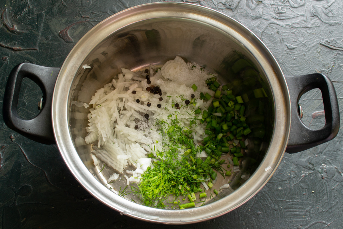 Лук нарезаем небольшими кубиками. Кладём в кастрюлю нарезанный лук, добавляем 2 столовые ложки измельченного укропа, несколько горошин черного перца и зубчик чеснока.