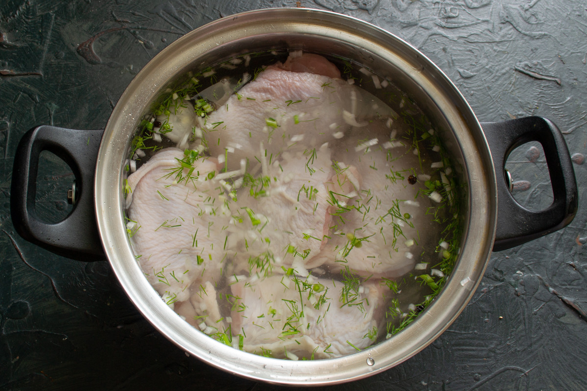 Достаем куски отварной курицы из бульона, прикрываем пищевой пленкой, чтобы не подсыхала. Процеживать бульон не нужно, так как мелко нарезанный лук почти растворяется в бульоне, а несколько горошин перца готовое блюдо не испортят.