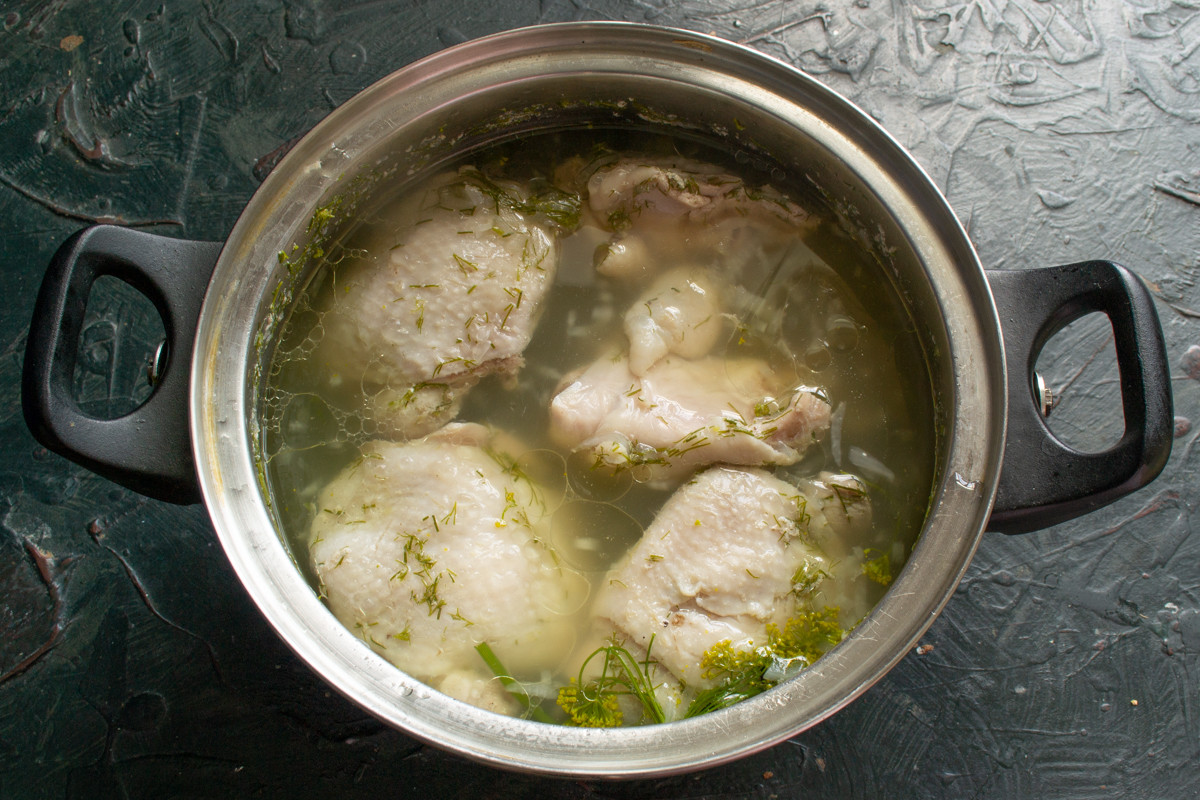 Отвариваем курицу до готовности. Чтобы бульон получился прозрачным, не делайте сильный огонь, пусть курица томиться в кастрюле на медленном огне примерно 1 час.