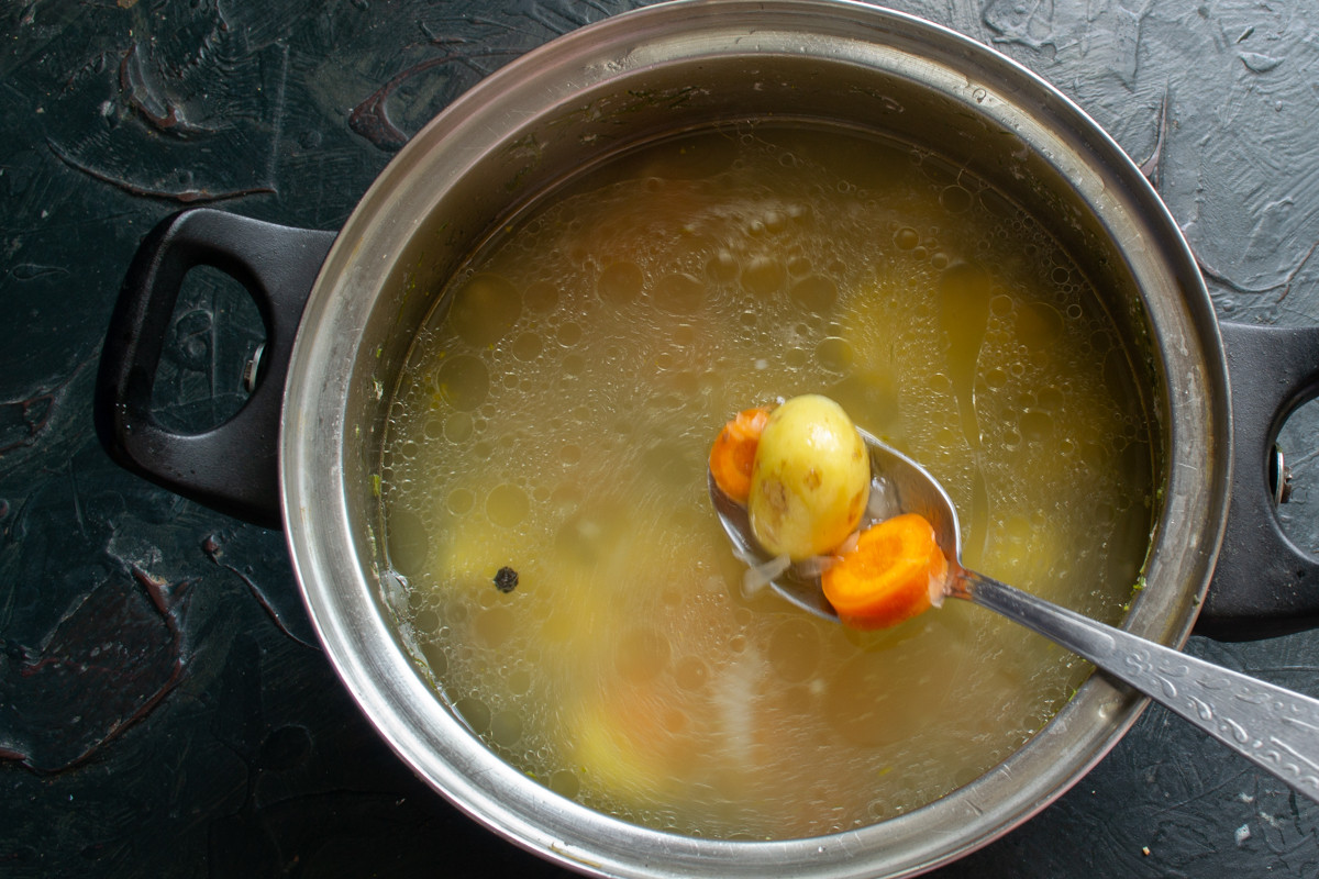 Молодой картофель и морковь скоблим или тщательно моем мочалкой с абразивным слоем. Нарезаем очищенную картошку крупно, молодую морковку режем толстыми кружками. Нарезанные овощи бросаем в кипящий бульон.