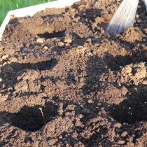 Для работы выбираем утренние или вечерние часы, можно высадить свеклу и днём, если стоит пасмурная погода. На подготовленных грядах делаем бороздки на расстоянии 20-25 см друг от друга или ряды лунок на таком же расстоянии с интервалом 10 см. В подготовленные места вносим фосфорно-калийные или любые комплексные удобрения для корнеплодов в соответствии с рекомендациями производителя.
