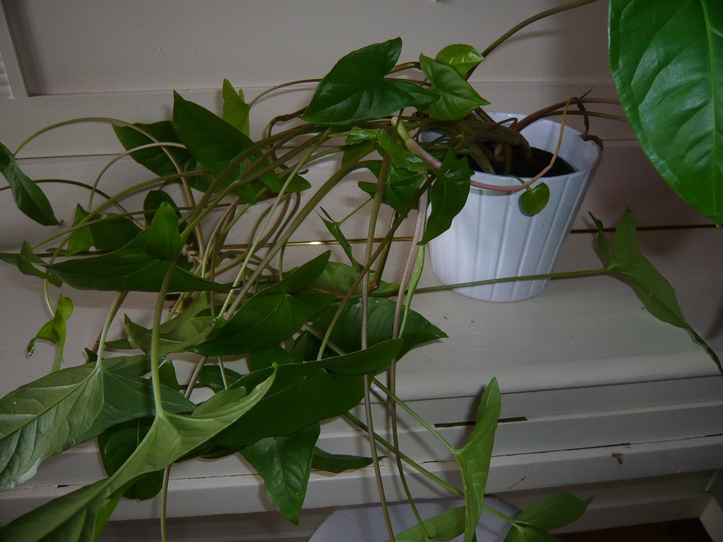 Пестролистые формы сингониума теряют окраску и становятся почти зеленого цвета — из-за недостатка света.