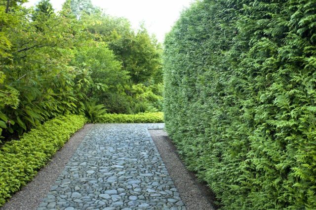 Туя идеально соответствует основным требованиям, предъявляемых к деревьям и кустарникам для живых изгородей: