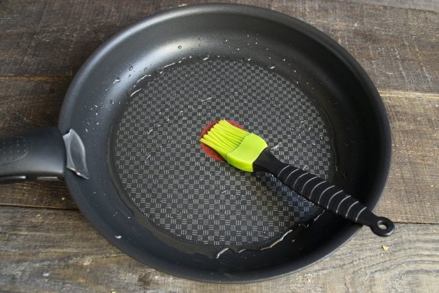 Большую сковороду с толстым дном нагреваем, смазываем тонким слоем рафинированного растительного масла.
