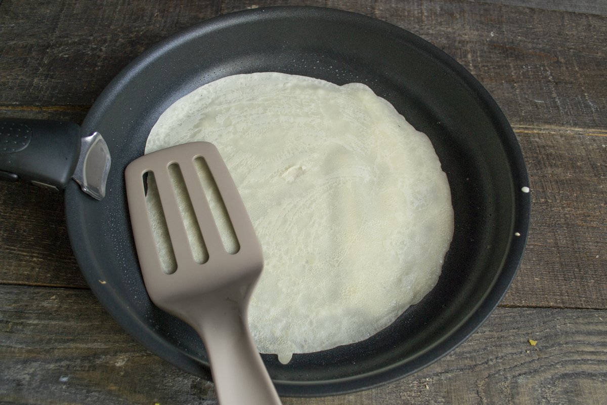 Наливаем тесто на край разогретой сковородки, наклоняем сковороду, чтобы тесто растеклось ровным слоем по всей нагретой поверхности. Жарим примерно 1 минуту с каждой стороны, подрумянивать не нужно.
