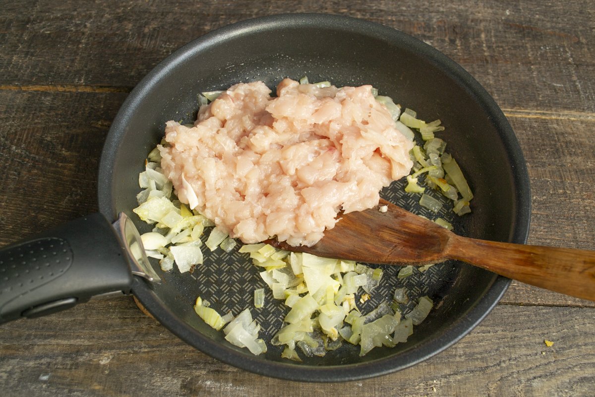 Добавляем мелко порубленный укроп, солим и перчим по вкусу, насыпаем немного любых специй — для курицы, для котлет. Обжариваем начинку 5 минут на сильном огне.