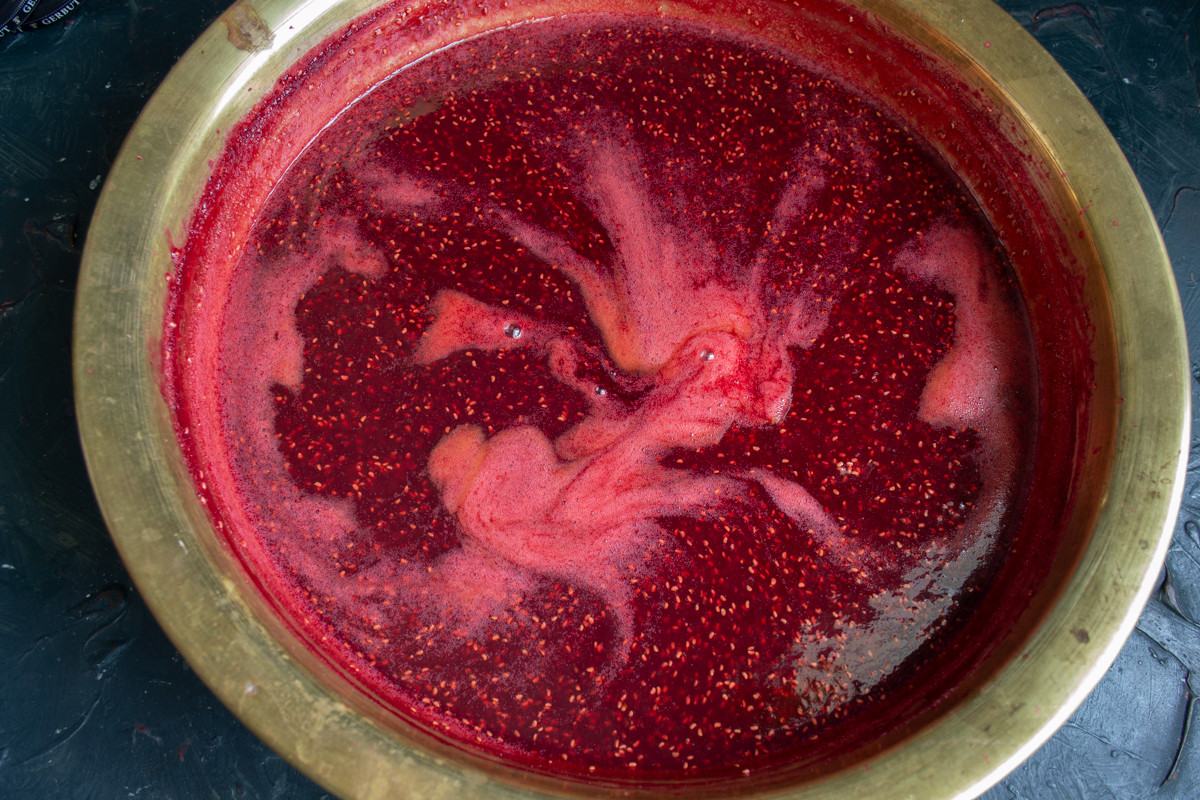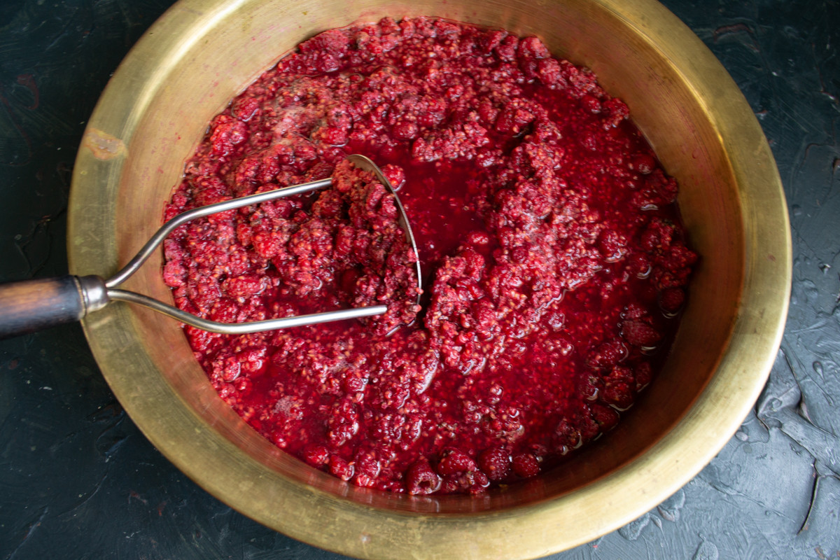 Для варки джема из малины подойдет широкая кастрюля или классический медный таз, я варю в тазу. Перекладываем малину в таз, разминаем картофельной толкушкой, чтобы выделился сок.