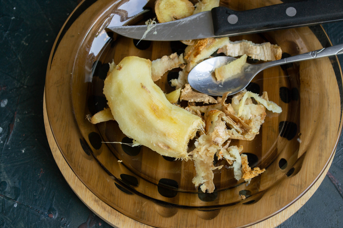Корень имбиря моем, чайной ложкой счищаем кожуру, вырезаем тёмные места. Молодой имбирь очень сочный, поэтому тереть его нужно над тарелкой, чтобы сок не пропадал, тёрку выбираем самую мелкую.