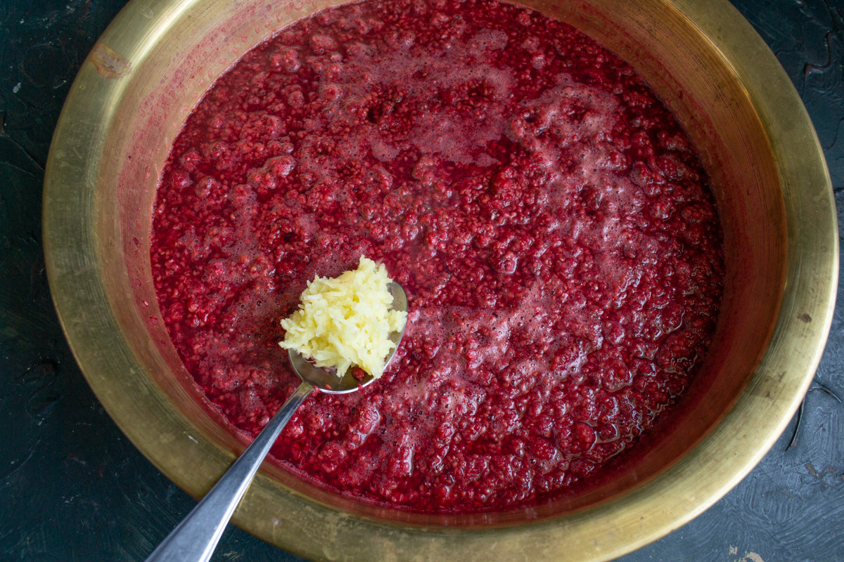 Добавляем тёртый имбирь к размятой малине, нагреваем до кипения на среднем огне.