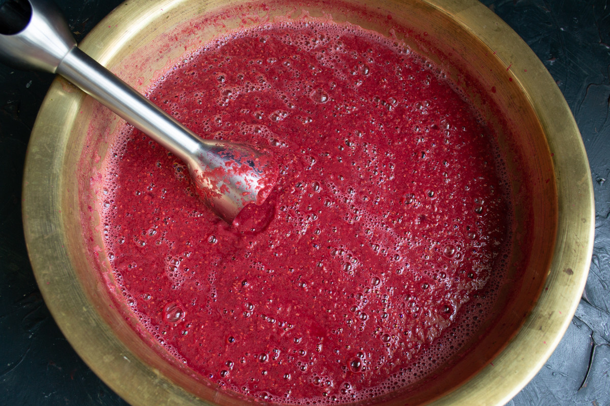 Кипятим ягоды с имбирем несколько минут, затем измельчаем погружным блендером до однородности. Будьте осторожны, горячие брызги разлетаются и могут обжечь!