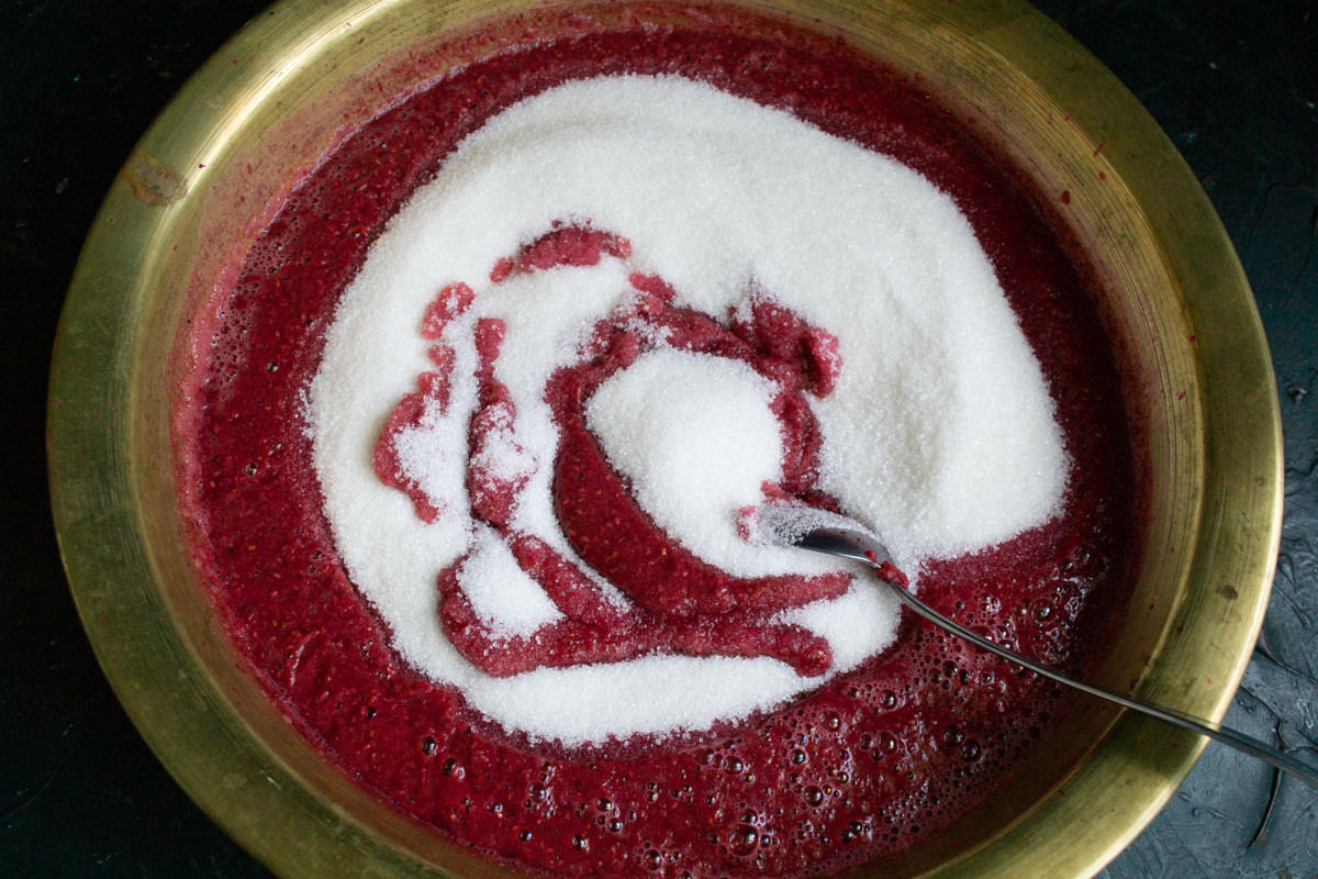 Насыпаем сахарный песок в таз, перемешиваем сахар с ягодным пюре, нагреваем до кипения.