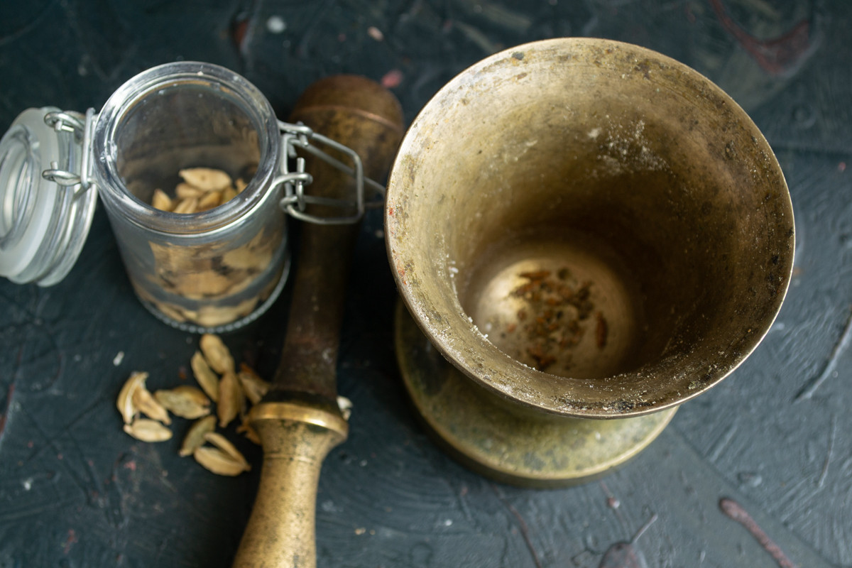Раскрываем коробочки кардамона, достаём зерна и растираем пестиком в ступе, чтобы получился ароматный порошок.