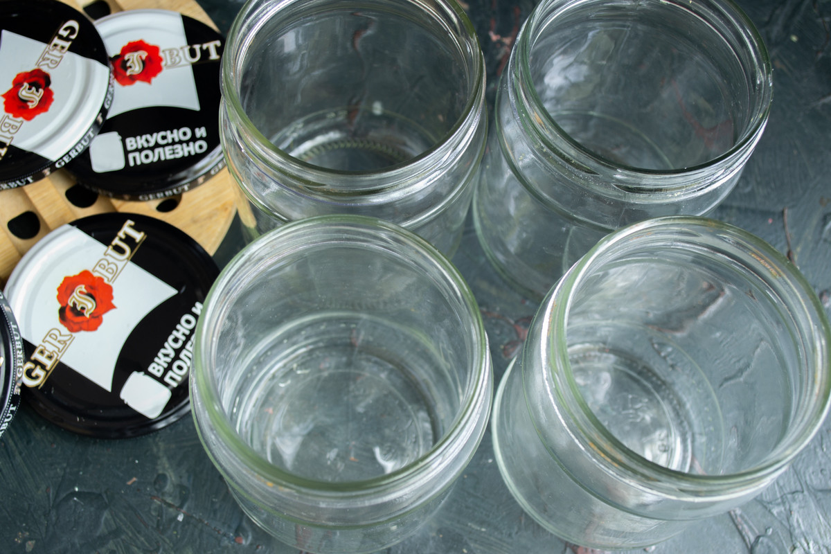 Банки моем тёплой водой с пищевой содой, затем тщательно ополаскиваем проточной водой, обдаём кипятком. Стерилизуем банки над паром или сушим в разогретом до 100 градусов Цельсия духовом шкафу. Крышки кипятим, выкладываем на полотенце, обсушиваем.