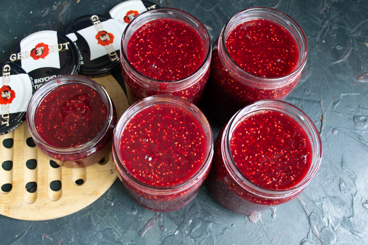 Горячий джем из малины с имбирем разливаем в тёплые банки сухим черпаком, заполняем банки по горлышко, не доходя до края примерно 1 сантиметр. Из указанных в рецепте ингредиентов у меня вышло 4 поллитровых банки плюс бонус – одна маленькая баночка 150-200 г. Прикрываем джем из малины с имбирём и кардамоном полотенцем, остужаем до комнатной температуры. Когда полностью остынет, закрываем плотно сухими крышками. Можно закрыть бумагой и завязать резинкой или веревкой, в таком виде джем тоже хорошо сохранится. Со временем, по мере испарения влаги, сверху образуется слой похожий на мармелад.