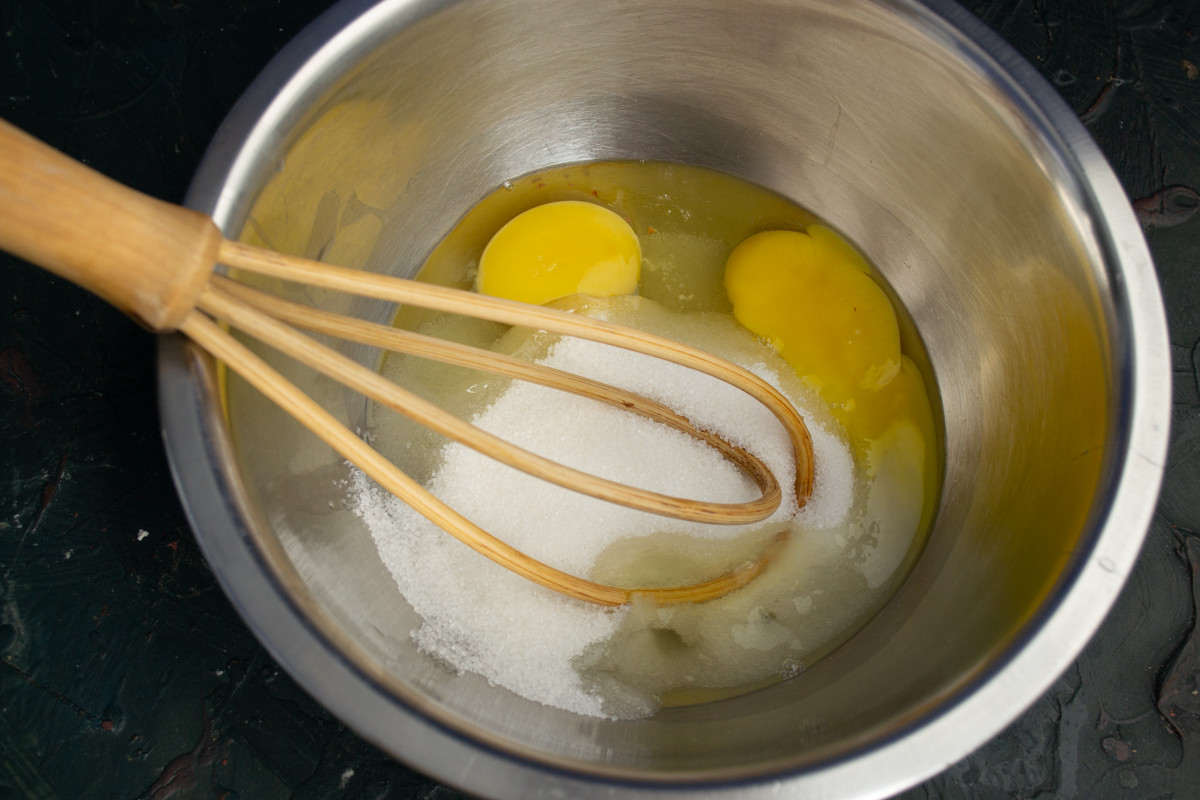 Делаем начинку. Сначала готовим заливку – смешиваем в глубокой миске сахарный песок, куриные яйца, взбиваем венчиком.