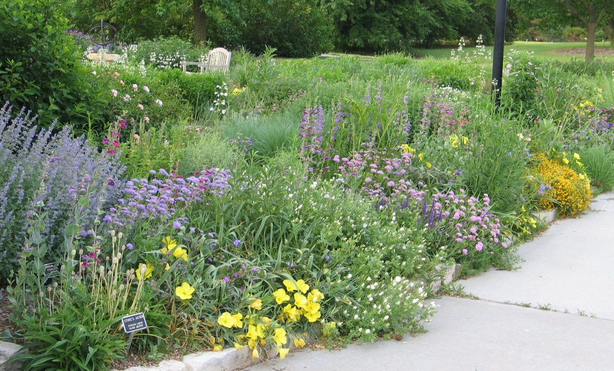 Низкорослые, почти подушечные, растущие плотными куртинками делосперма Купера, каллирое покрывальное, пестролистные чабрецы, ползучие очитки дополнят картину на переднем плане или заполнят куртины.