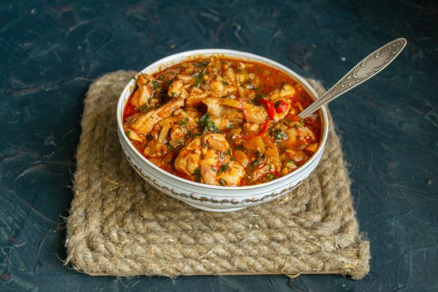 В этом рецепте рагу из куриных бедер (только мясо), поэтому на приготовление уходит чуть больше получаса. Если будете готовить блюдо из целой курицы, нарезанной на кусочки с кожей и костями, то понадобится примерно на 25 минут больше времени.