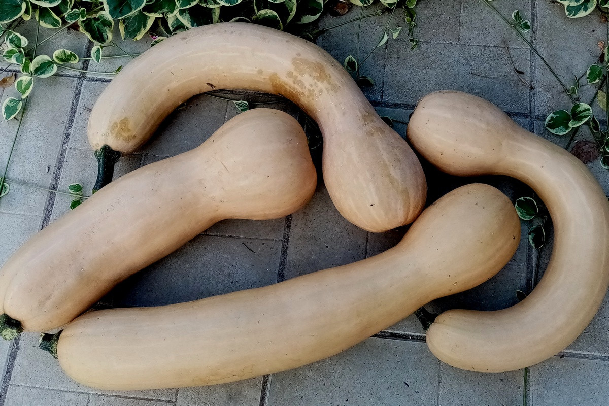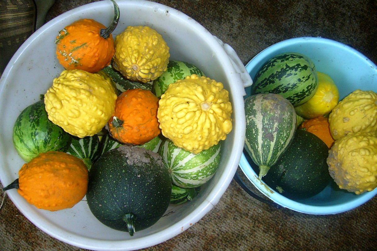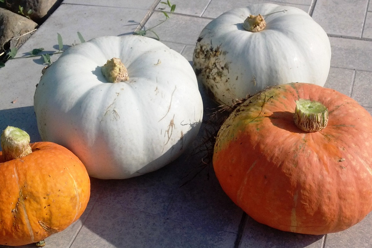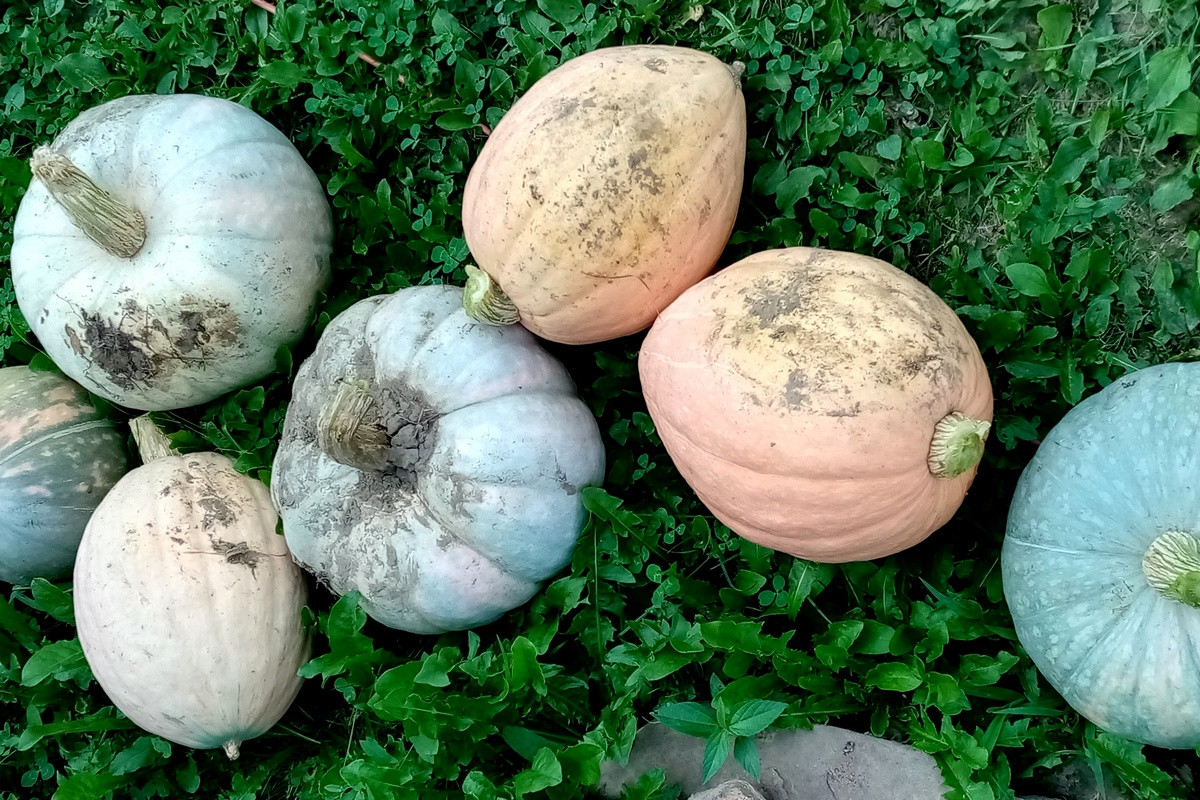 Тыквы срезаем по мере созревания (когда «хвостик» одеревенел и посветлел). Плоды к этому времени, как правило, окончательный цвет не приобретают — с цветом некоторые ближе к Новому году только определяются, особенно твердокорые. Пока тепло, тыквы лежат под навесом на сквознячке: у них укрепляется кожура, они дозревают. При приближении ночных температур к нулевым значениям, убираем их на хранение. Те, у которых относительно тонкая шкурка — «жёлуди», «гитары», «бананы» и часть порционных будут живописно лежать на кухне. Твердокорые отправляются в кладовку, они пойдут в ход после новогодних праздников.