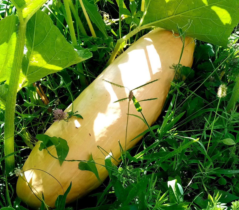 Интересные бонусы предоставляют тыквы-«гитары»: если начать их резать со стороны плодоножки, есть плод можно неделю-полторы: отрезал кусочек, остальное лежит, срез заветривает, но не портится. Потом следующий кусочек — и так до семенной камеры. У нас лежат даже не в холодильнике, а просто на кухне.