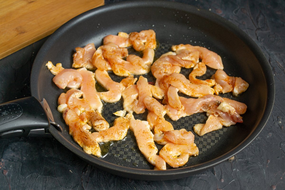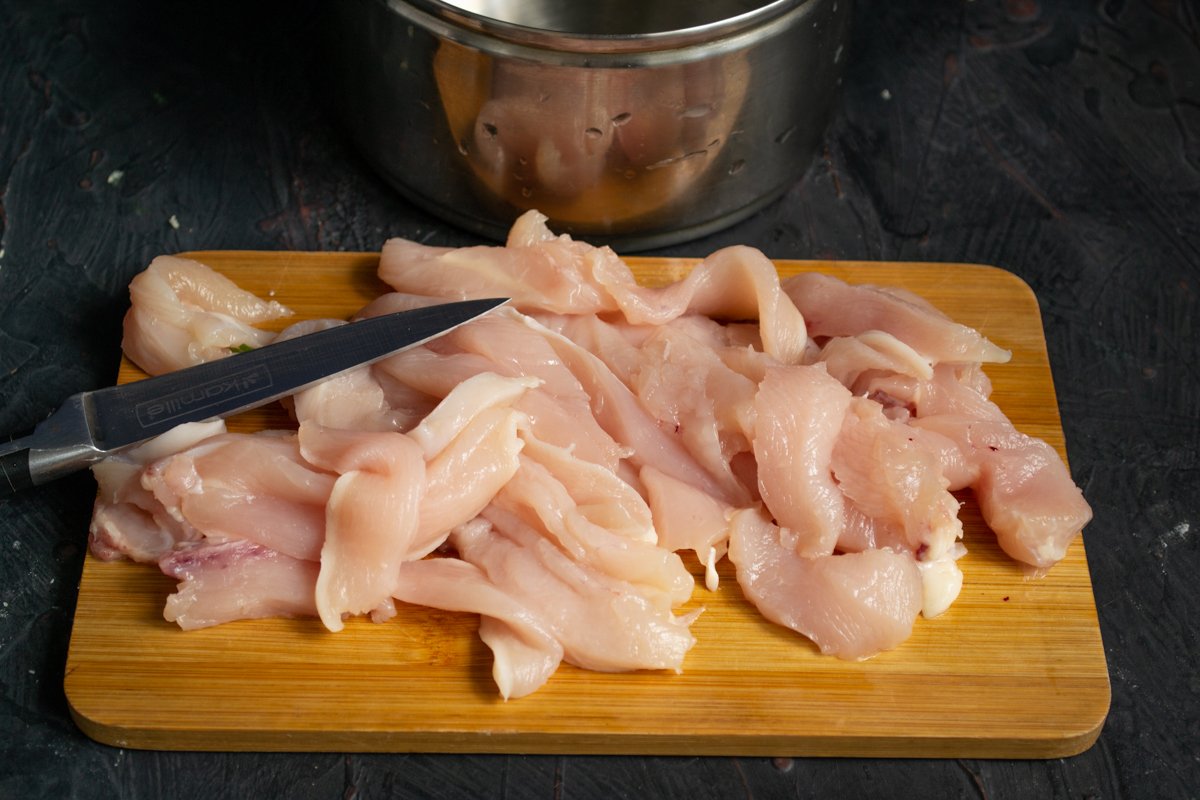 Филе куриной грудки нарезаем тонкими узкими полосками. Для этого рецепта тёплого диетического салата грудку резать нужно поперёк волокон, так ломтики курочки сохранят форму при жарке.