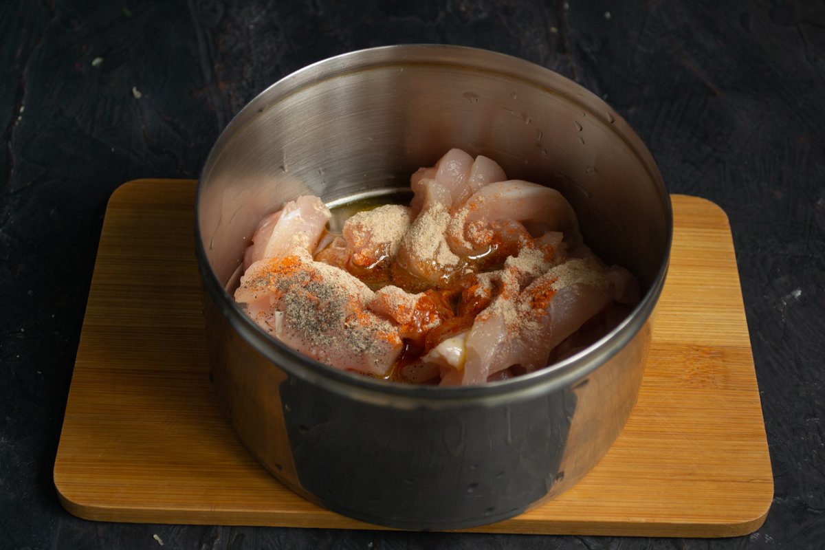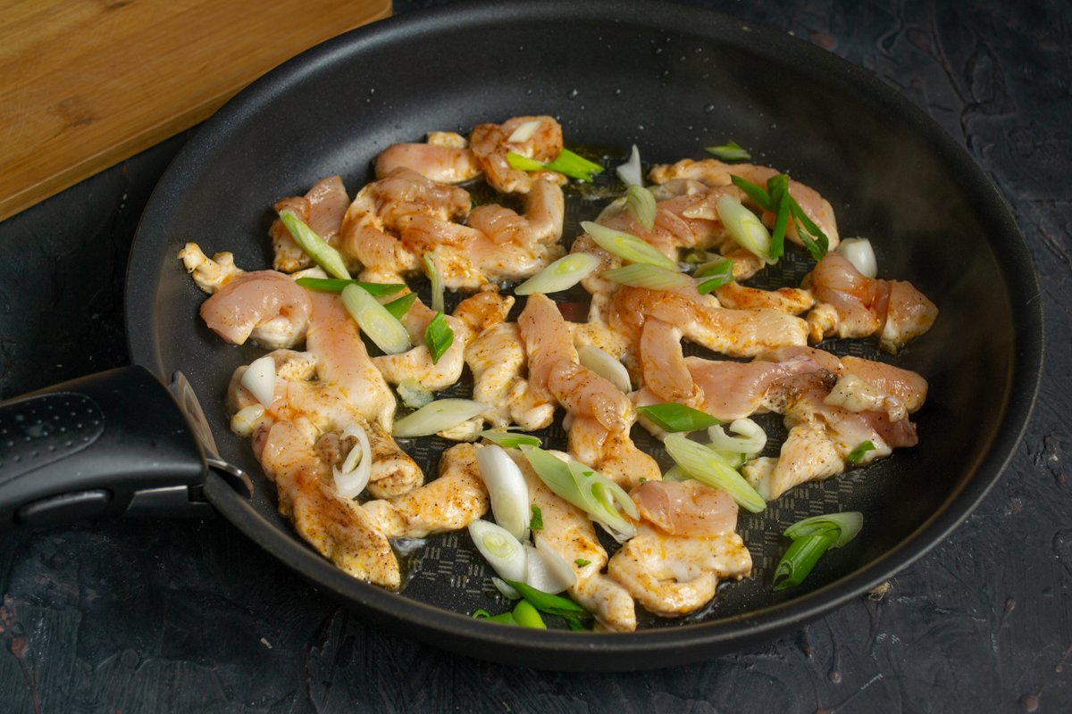 Нагреваем сковороду с антипригарным покрытием, маслом смазывать не нужно, оно уже есть в маринаде. На хорошо разогретую сковородку выкладываем курочку, жарим на сильном огне 5 минут.