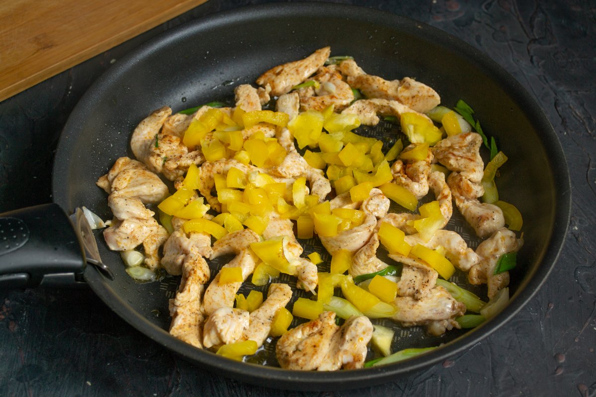 Половинку сладкого мясистого перца режем небольшими кубиками, отправляем в сковороду следом за луком.
