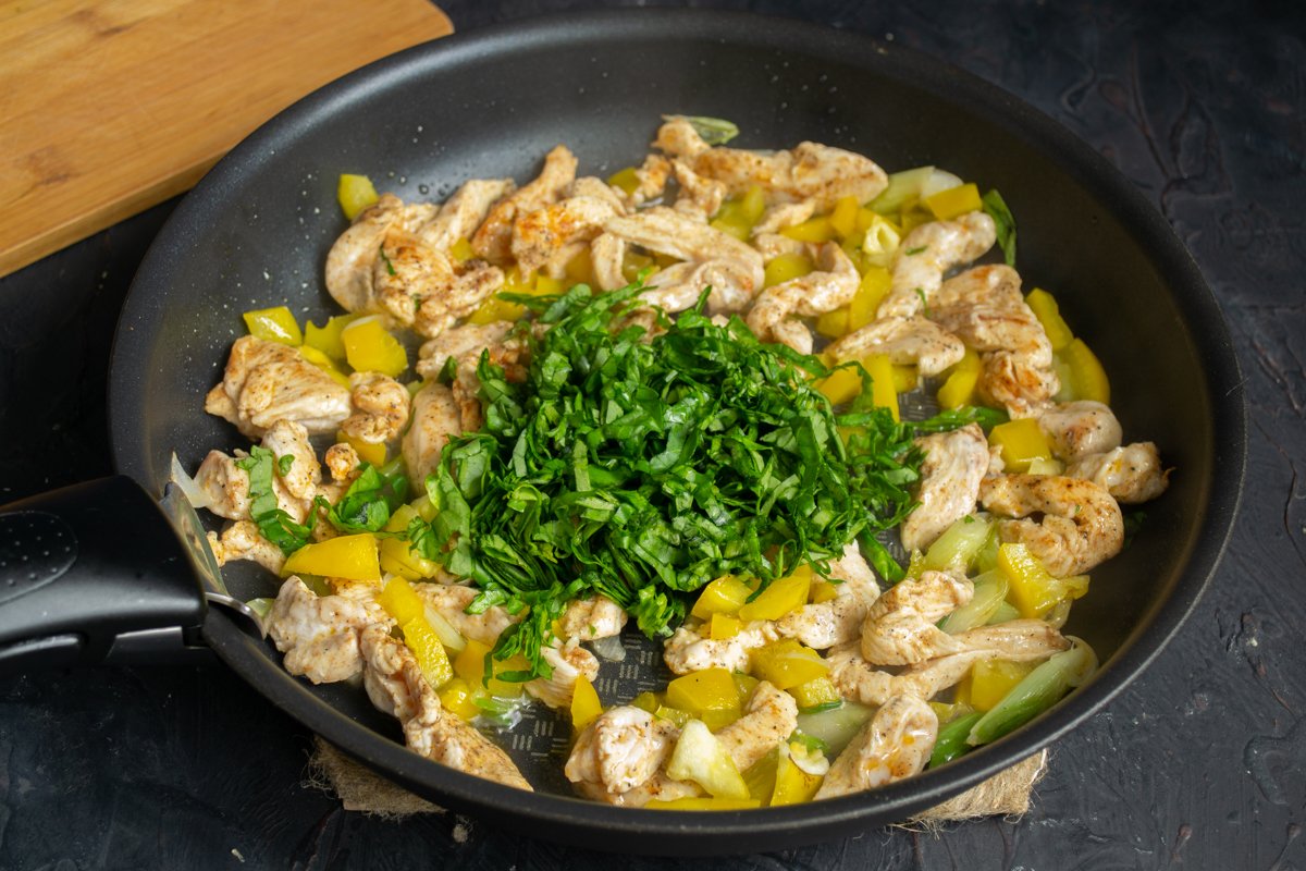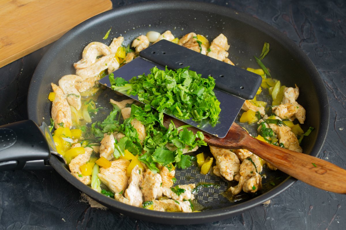 Добавляем мелко порезанную петрушку или кинзу, на сильном огне готовим курицу с овощами 3-4 минуты. Снимаем сковороду с огня и посыпаем блюдо морской солью по вкусу. Для приготовления зелени этого времени достаточно, а кусочки сладкого перца будут аль-денте.