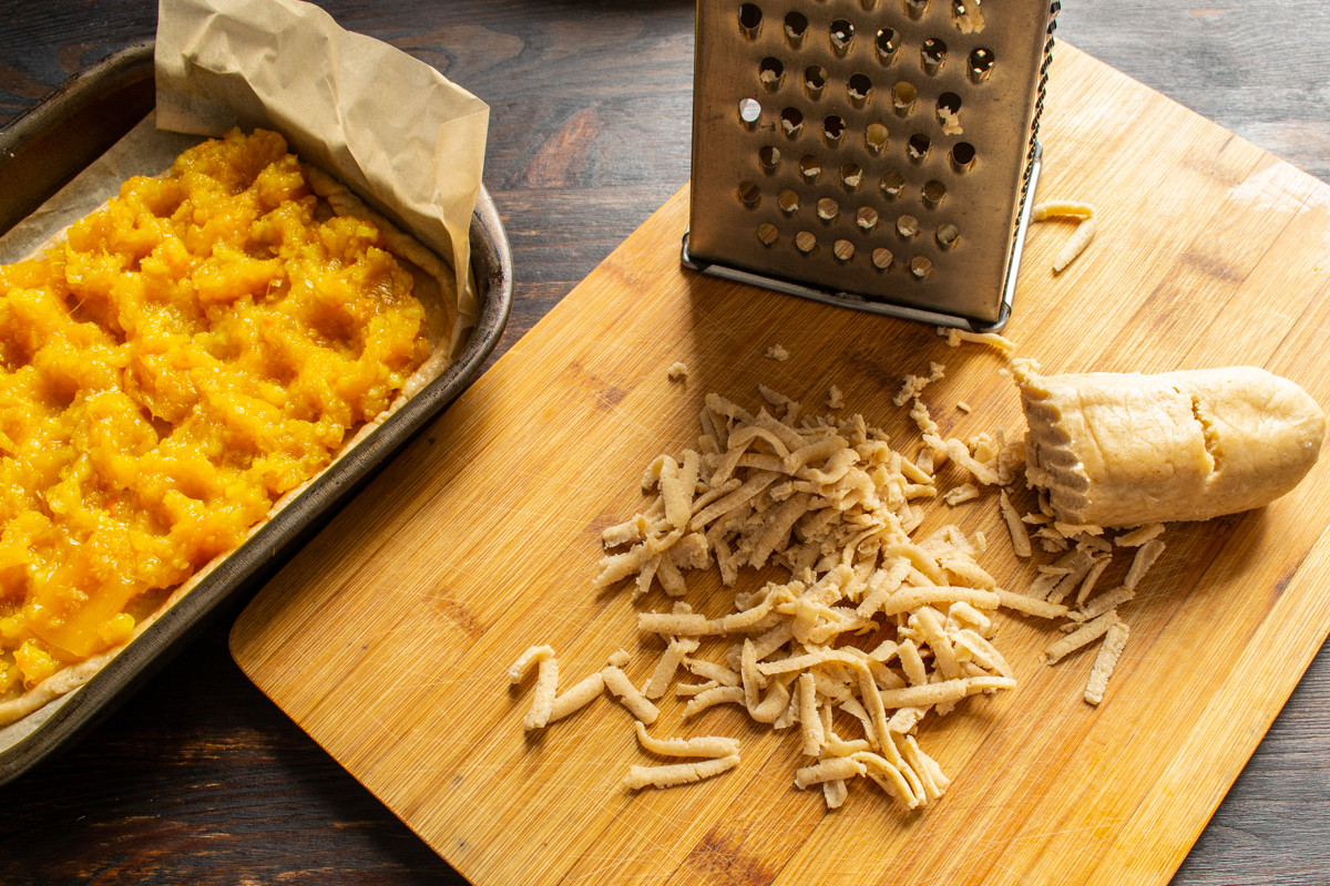 Достаем тесто из морозильной камеры, натираем на крупной терке.