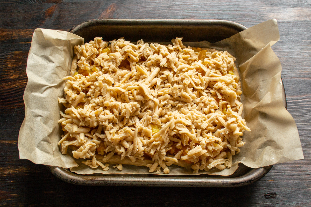 Переносим тесто в форму. Формируем небольшой бортик по краю коржа, чтобы сок из начинки не вытекал из пирога. Размер формы в этом рецепте 20х18 сантиметров.