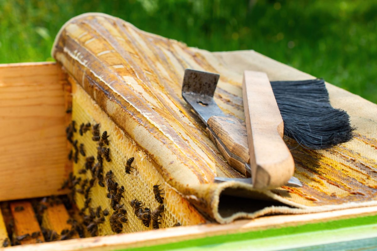 Откачку лучше проводить в теплую сухую погоду, утром или вечером, когда лёт пчел слабее. Рамки забираете из улья, стряхиваете пчел обратно (или сметаете щеткой), уносите в помещение. Там срезаете восковые крышечки ножом (или специальной вилкой) и ставите рамки в медогонку.