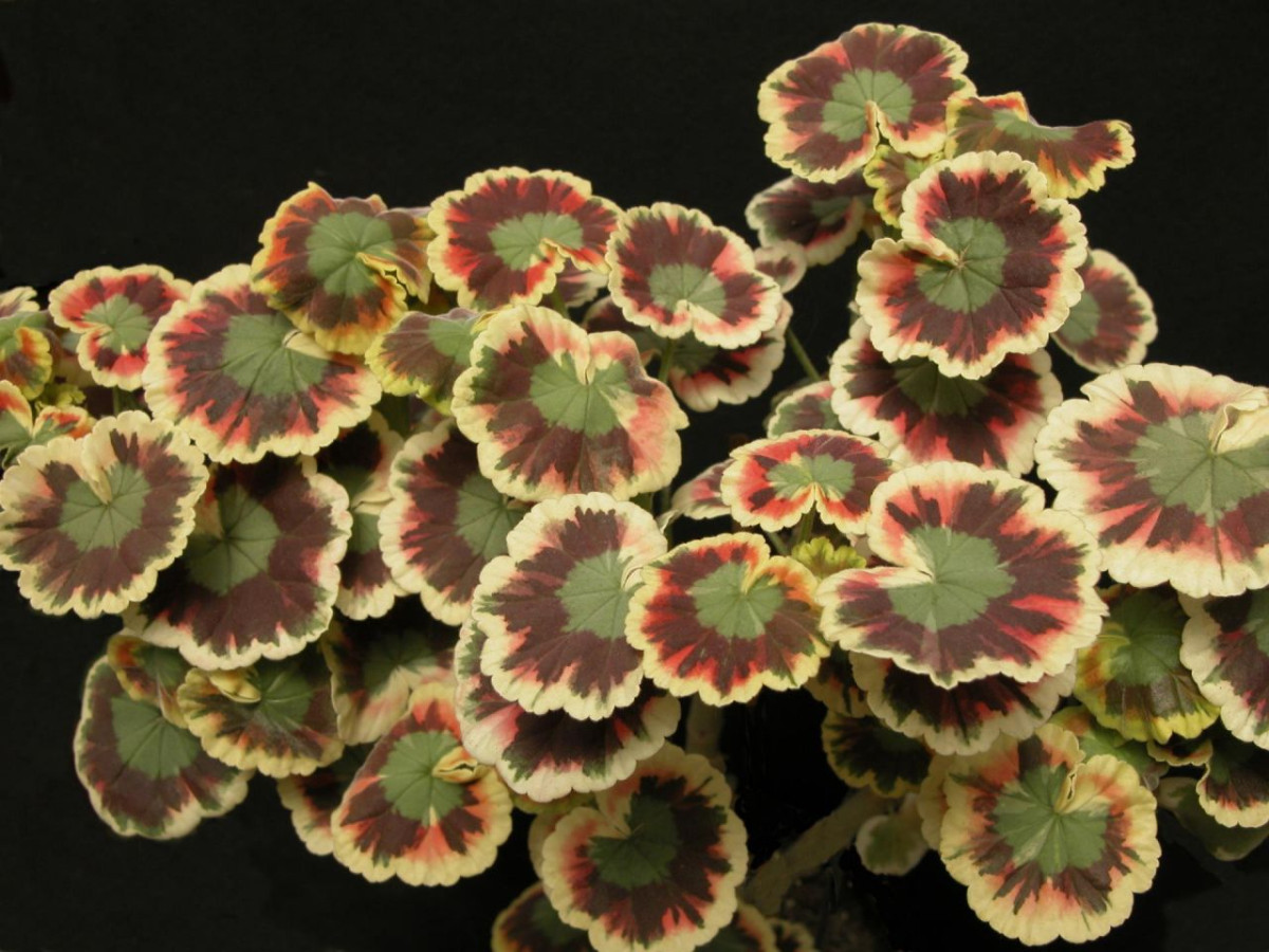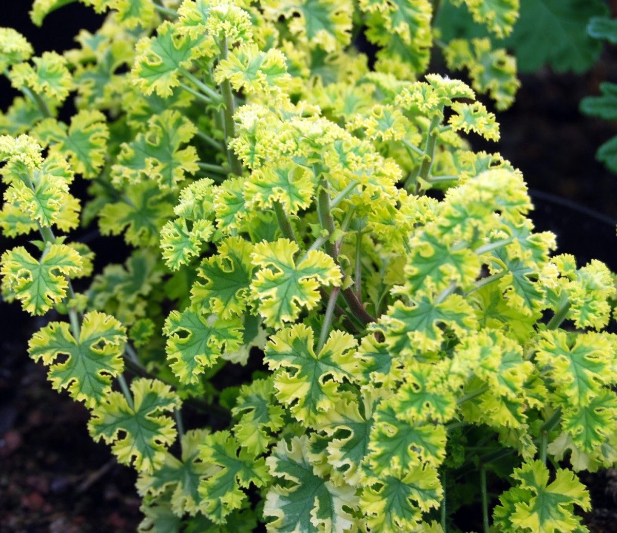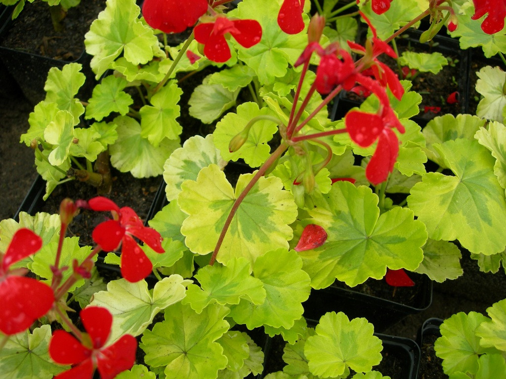 Этот сорт с причудливыми листьями отличается ярко-красными цветами, которые особенно выделяются на фоне необычной листвы. Сама же окраска листьев бледная, желто-зеленая с более глубокой зоной «бабочки» в центре.«Мэнглс Вариегатед» (Pelargonium ’Mangles Variegated’) выращивают в первую очередь из-за таких примечательных листьев, которые выделяют их среди остальных пеларгоний.
